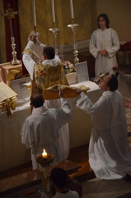 Dopo il Gloria e l’Orazione di Colletta (faccio notare che nel rito domenicano il celebrante per salutare i fedeli con il Dominus vobiscum si volge, più sobriamente, stando presso il messale e senza baciare prima la mensa come avviene nel romano), un ministrante ha proclamato l’Epistola (2 Tim, 4, 1-18); il celebrante dopo aver letto i brani interlezionali (Responsorium – che corrisponde al Graduale romano - Alleluja e Sequenza) nel frattempo eseguiti dai cantori in gregoriano, ha tolto il velo dal calice preparato all’altare e vi ha infuso il vino e l’acqua che prima ha benedetto dicendo semplicemente: In nomine Patris, et Filii et Spiritus Sancti. Dopo aver ricoperto nuovamente il calice e infuso l’incenso, una volta spostato il messale, il celebrante si è preparato alla proclamazione in canto del santo Vangelo (Matt. 4, 13-19). Caratteristico il gesto all'inizio e alla fine della pericope evangelica di farsi il segno di croce. È in questo momento in cui ha preso la parola don Paolo Rakic – amministratore della parrocchia – che ha rivolto, a nome della comunità, un caloroso saluto e benvenuto a padre Didier Baccianti il quale ha poi tenuto l’omelia che sotto riporto.
